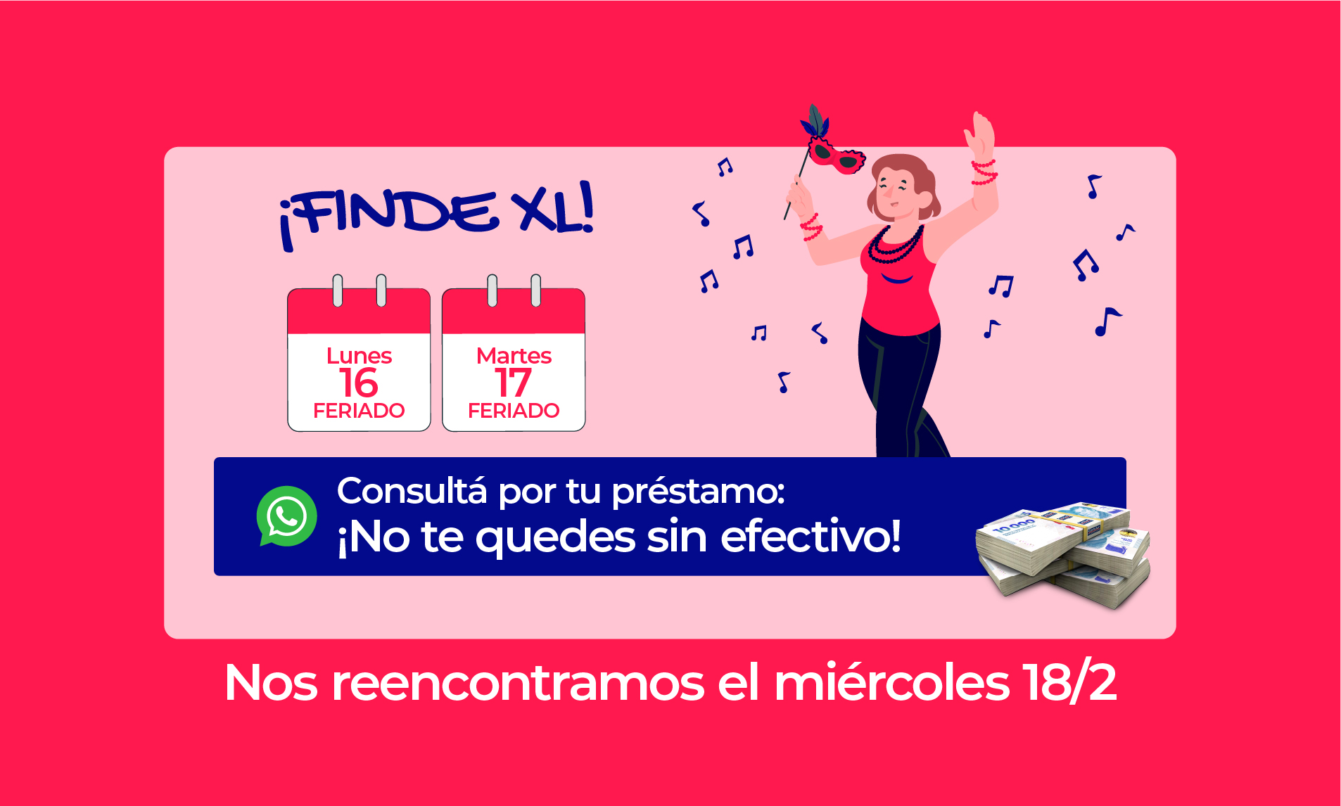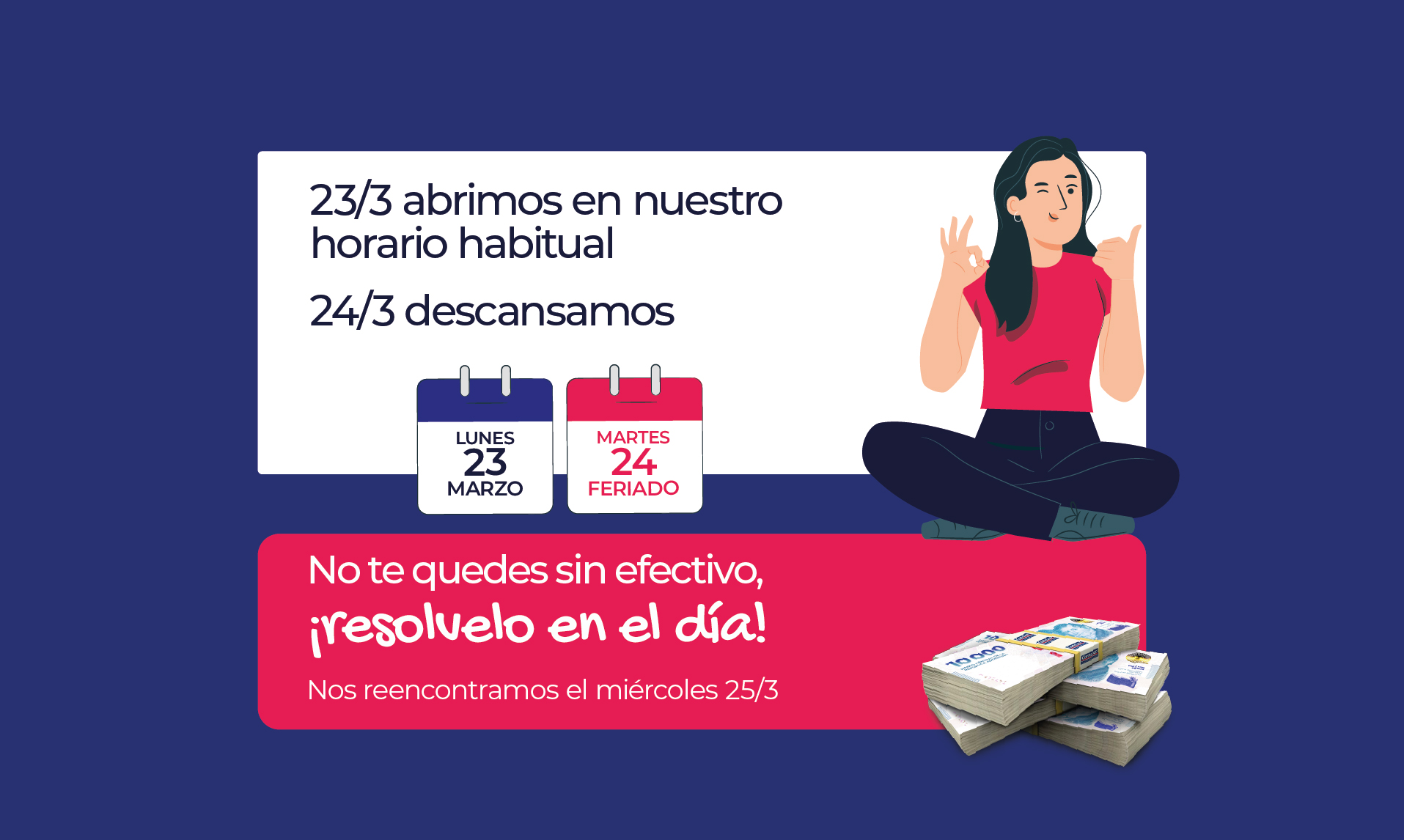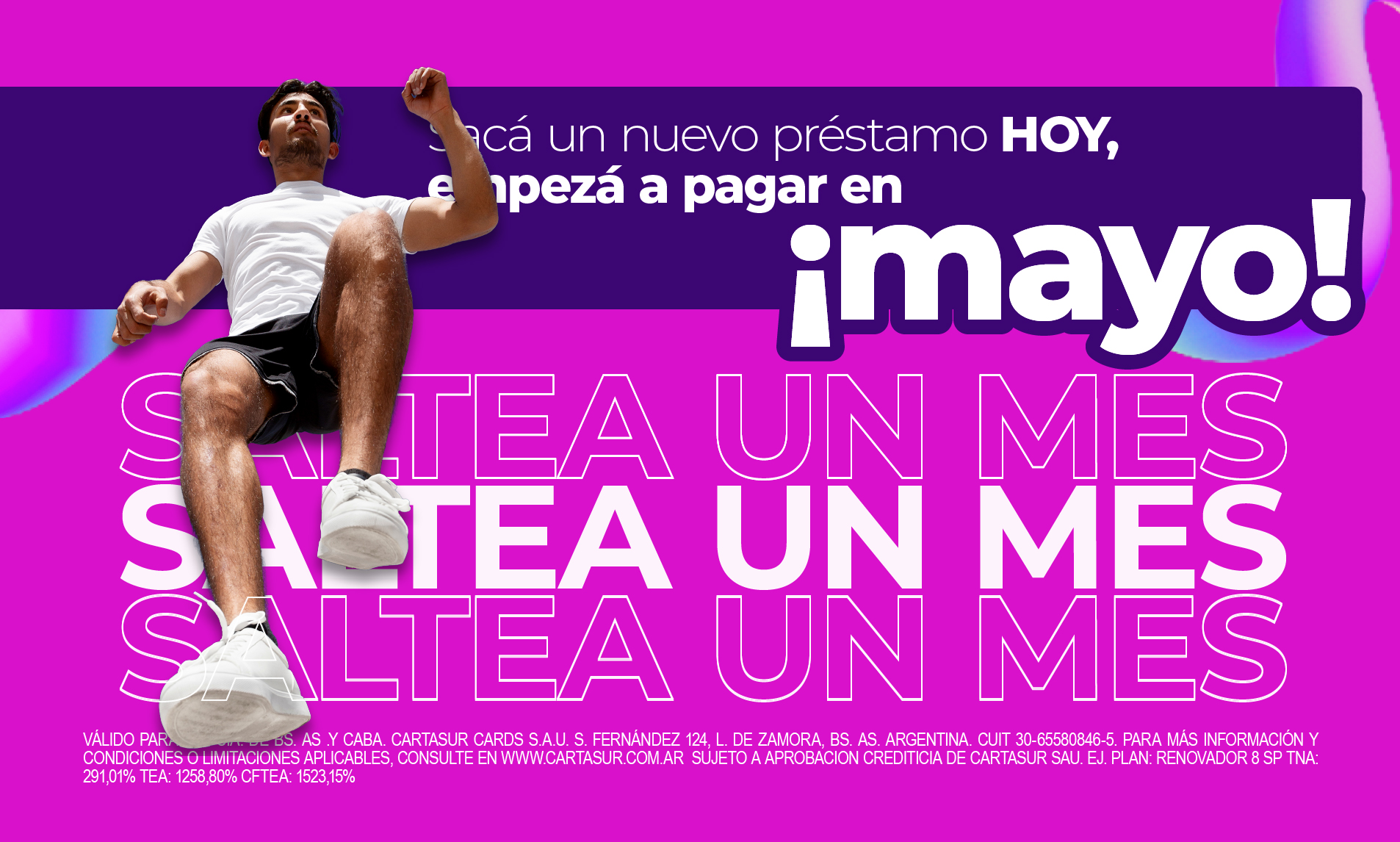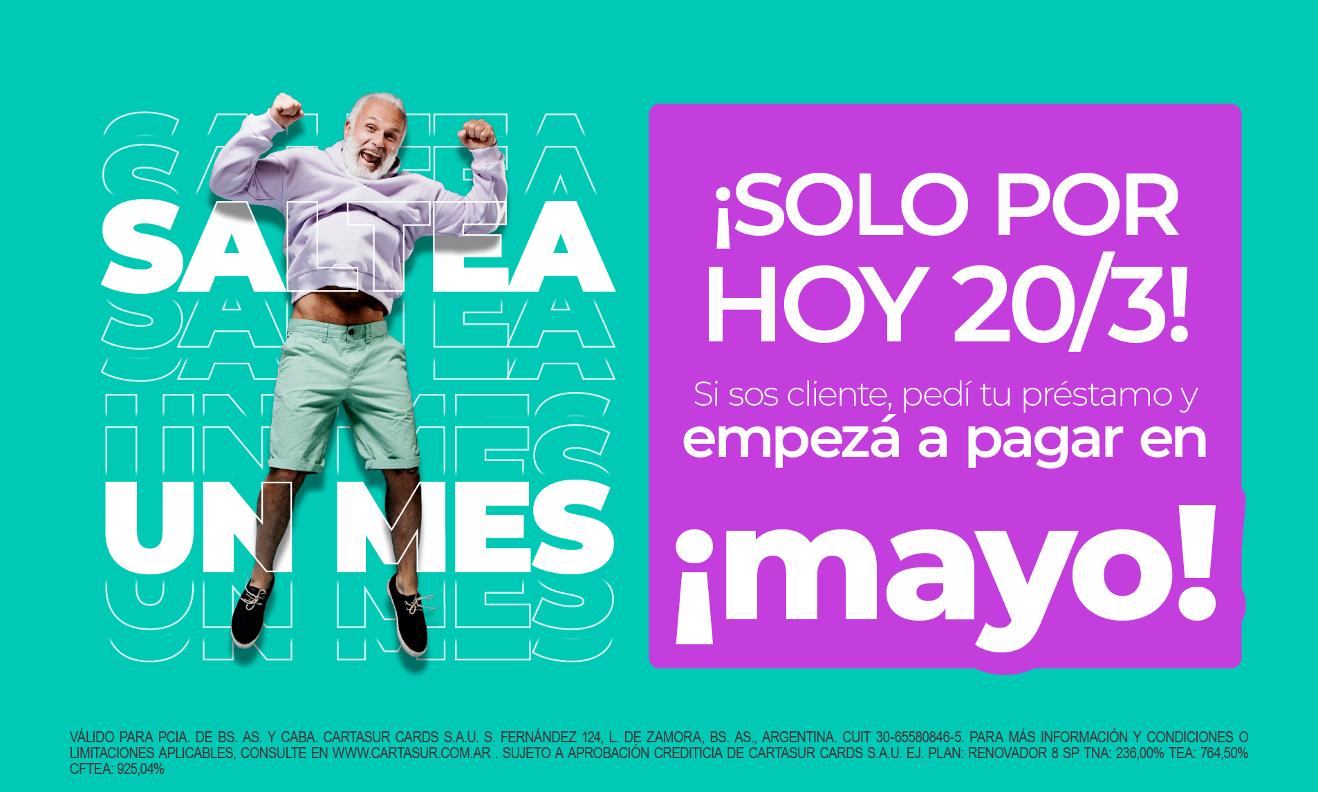 El otorgamiento del préstamo personal se encuentra sujeto a calificación crediticia y condiciones de contratación. La Tasa Nominal Anual (TNA), la Tasa Efectiva Anual (TEA) y el Costo Financiero Total Efectivo Anual (CFTEA) varían según el perfil crediticio del solicitante del préstamo y el plazo de financiación elegido. Monto mínimo $30.000.- máximo $4.000.000-. Plazo mínimo 1 mes, máximo 36 meses. Tasa Nominal Anual (TNA) sin IVA mínima 70.00%, máxima 393.00%, Tasa Efectiva Anual (TEA) sin IVA mínima 97.51%, máxima 2913.23%.