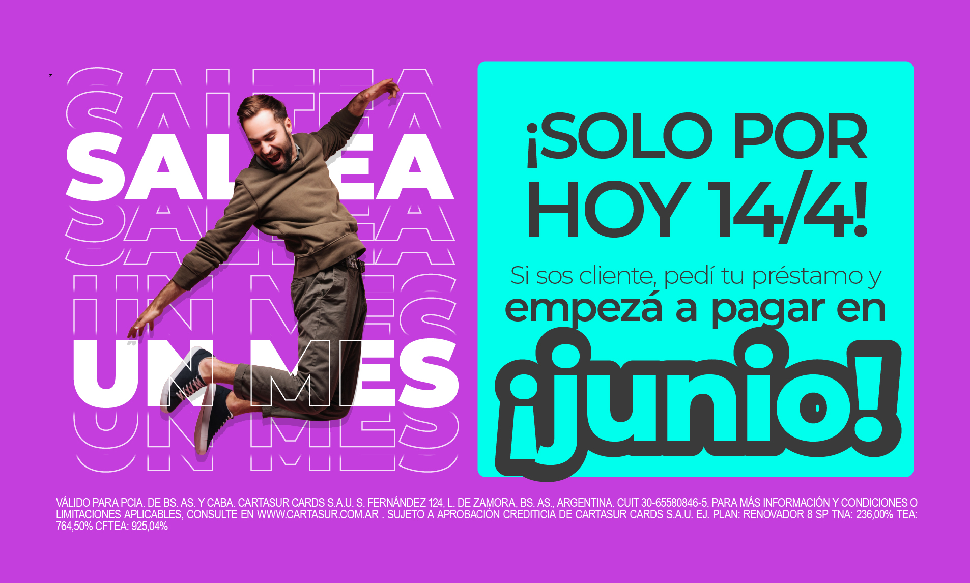 Ejemplo (para plan «Mora Cero”): Importe de crédito $10.000 en 35 cuotas de $550. Las cuotas incluyen IVA. No existen cargos o gastos asociados a la adjudicación de los préstamos personales. La tasa de interés TNA es fija, por consiguiente, la TEA y CFT asociadas también lo son. Precio total financiado: $19.250. TNA 70.00%. TEA 97.51. CFTEA (con IVA) 117.98%. La tasa será decreciente para los clientes con antigüedad y buen comportamiento de pago. Abonando el 50% del préstamo podrá renovarse el mismo con la posibilidad, sujeta a aprobación, de aumentar el monto de otorgamiento. Las cuotas del préstamo son mensuales, iguales y consecutivas, y serán abonadas en sucursales de CartaSur o a través de cualquier medio de pago habilitado, los cuales se pueden consultar en https://www.cartasur.com.ar/medios-de-pago/. Para el caso de mora en el pago de las cuotas, la empresa se reserva el derecho de iniciar las acciones legales extrajudiciales y judiciales pertinentes.