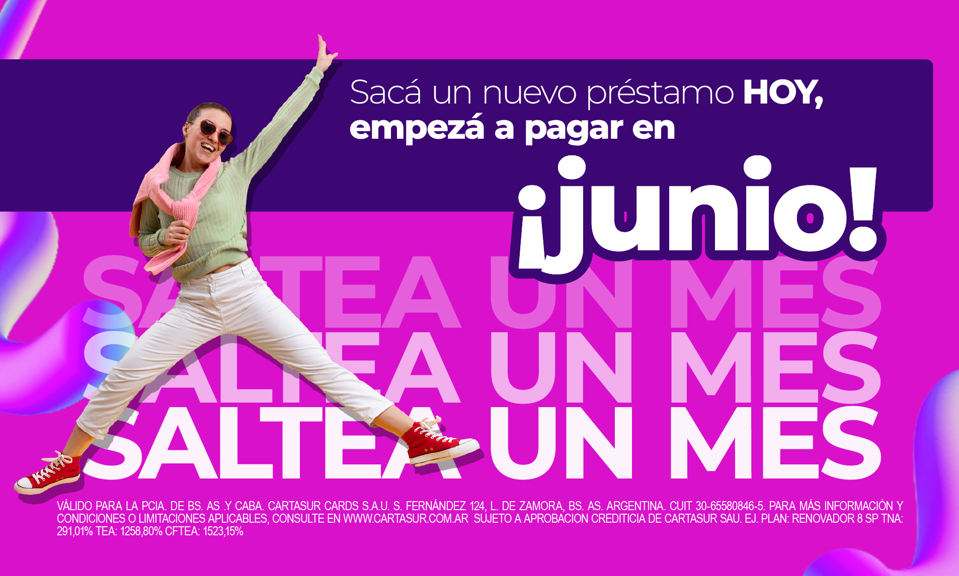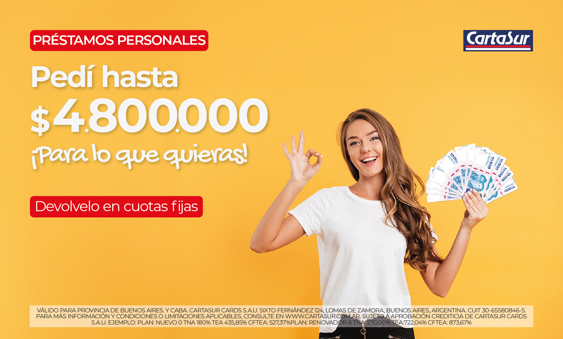 El otorgamiento del préstamo personal se encuentra sujeto a calificación crediticia y condiciones de contratación. La Tasa Nominal Anual (TNA), la Tasa Efectiva Anual (TEA) y el Costo Financiero Total Efectivo Anual (CFTEA) varían según el perfil crediticio del solicitante del préstamo y el plazo de financiación elegido. Monto mínimo $30.000.- máximo $4.800.000-. Plazo mínimo 1 mes, máximo 36 meses. Tasa Nominal Anual (TNA) sin IVA mínima 70.00%, máxima 393.00%, Tasa Efectiva Anual (TEA) sin IVA mínima 97.51%, máxima 2913.23%.