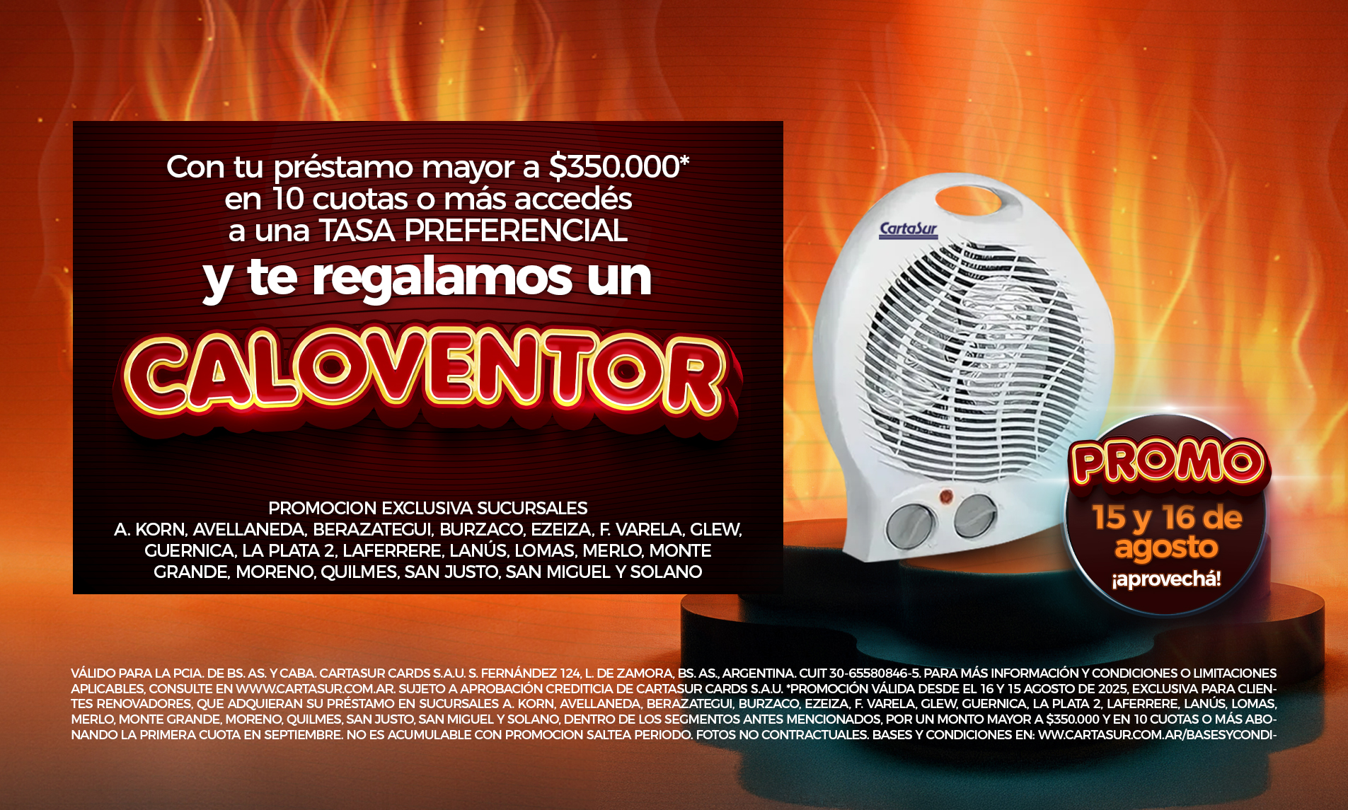 🥳Si sos cliente, esta promo es para vos! Hoy 15 y mañana 16/8 con tu renovación mayor a $350.000 y en 10 o mas cuotas, te llevás de regalo un caloventor 🎁!!
